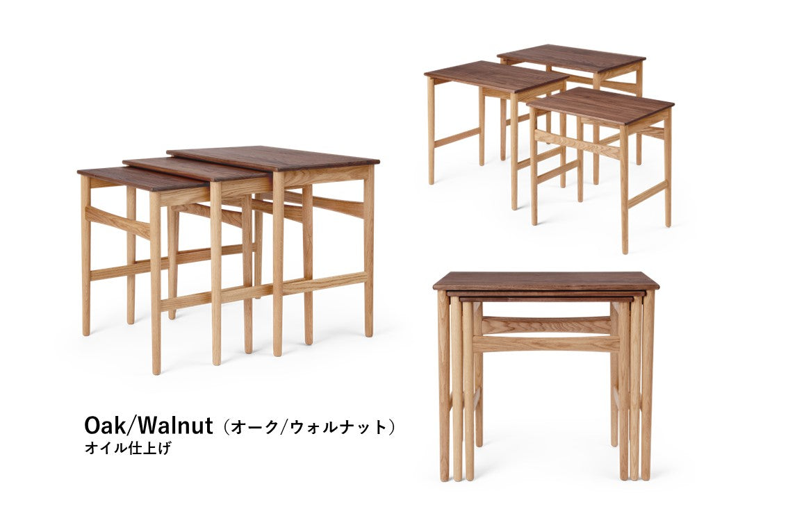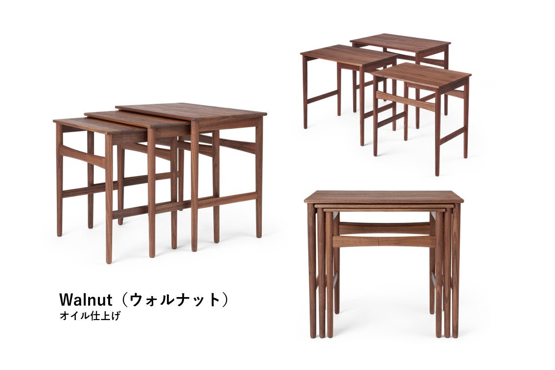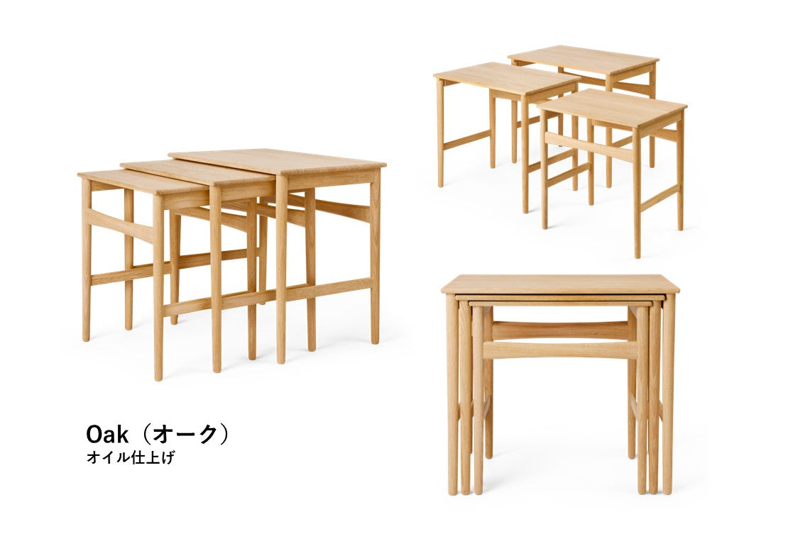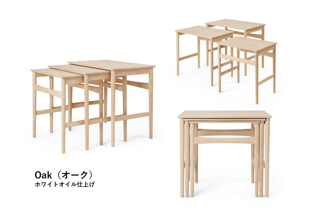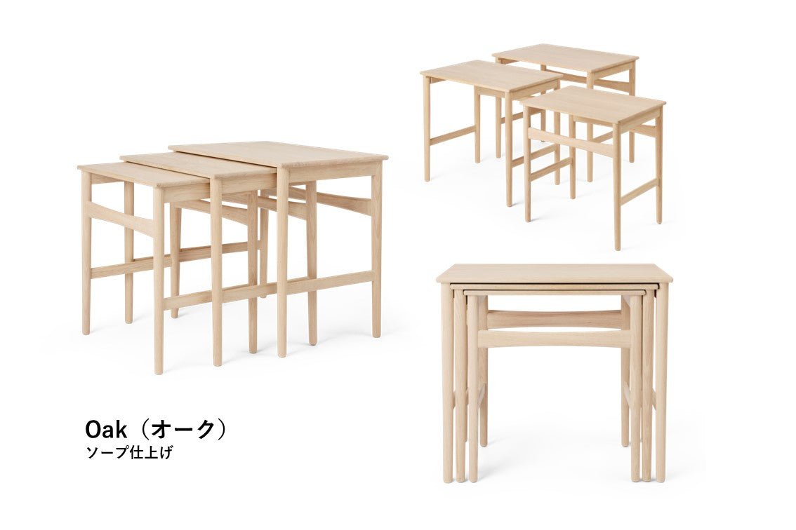 1952年に発売された、ハンス J. ウェグナーのアイコニック的なネスティングテーブル。3台の異なるサイズのテーブルで構成されており、個別にも組み合わせても使用可能です。