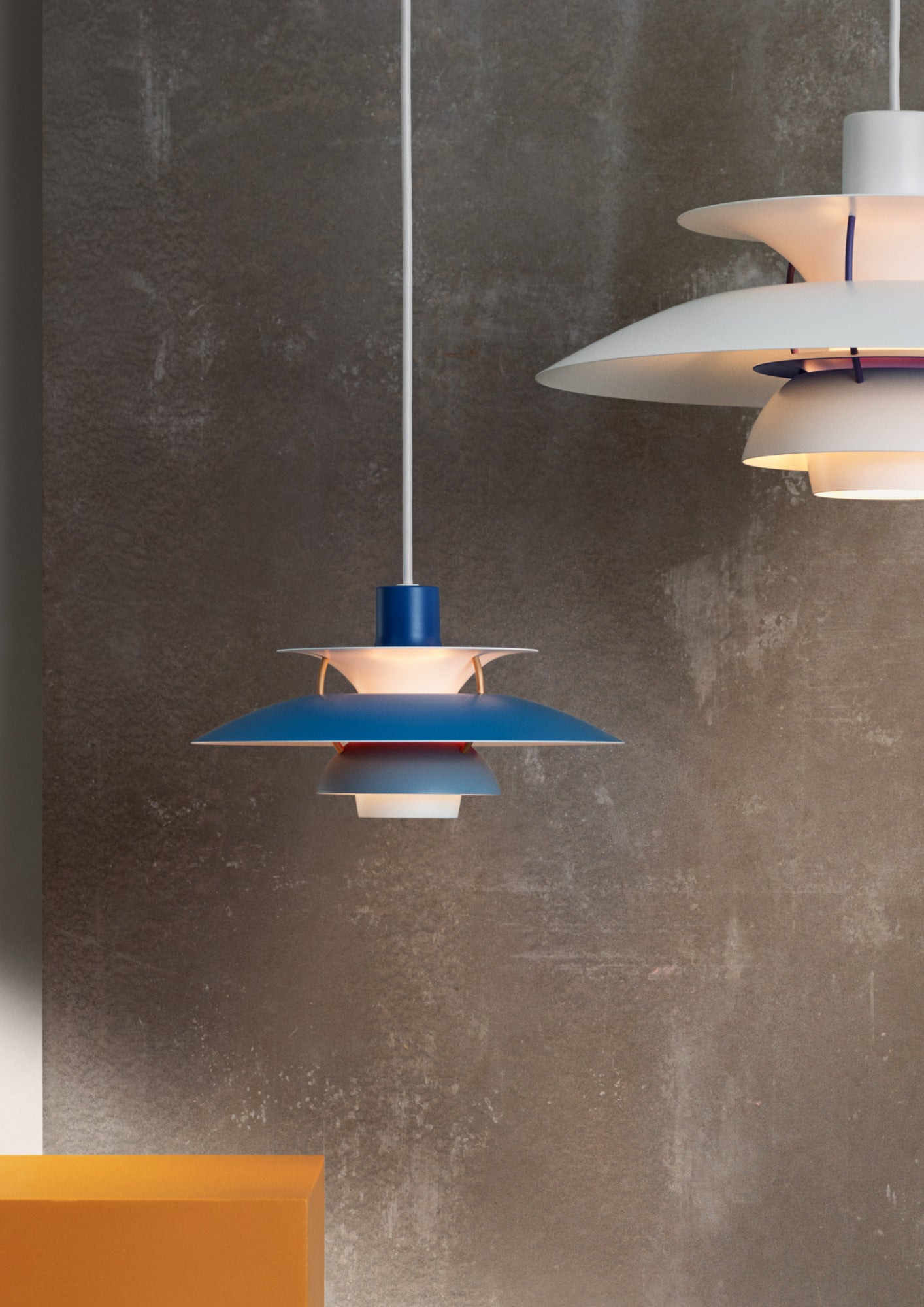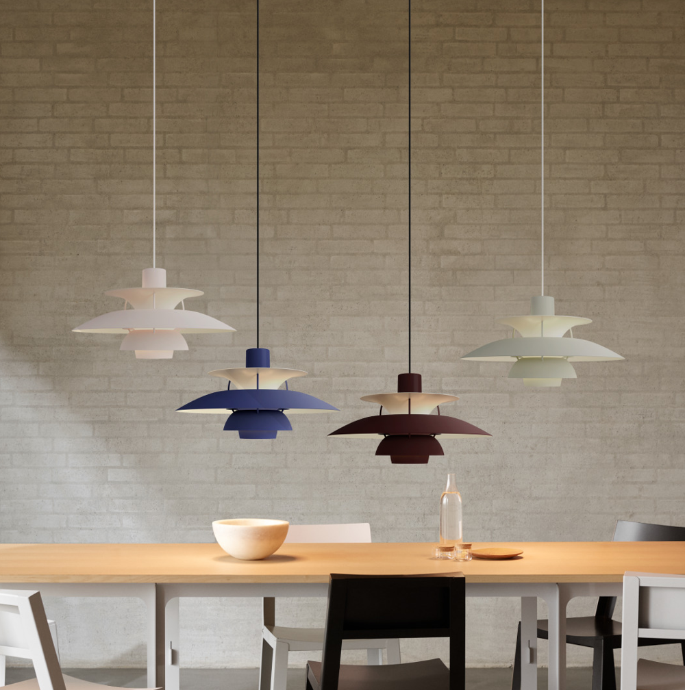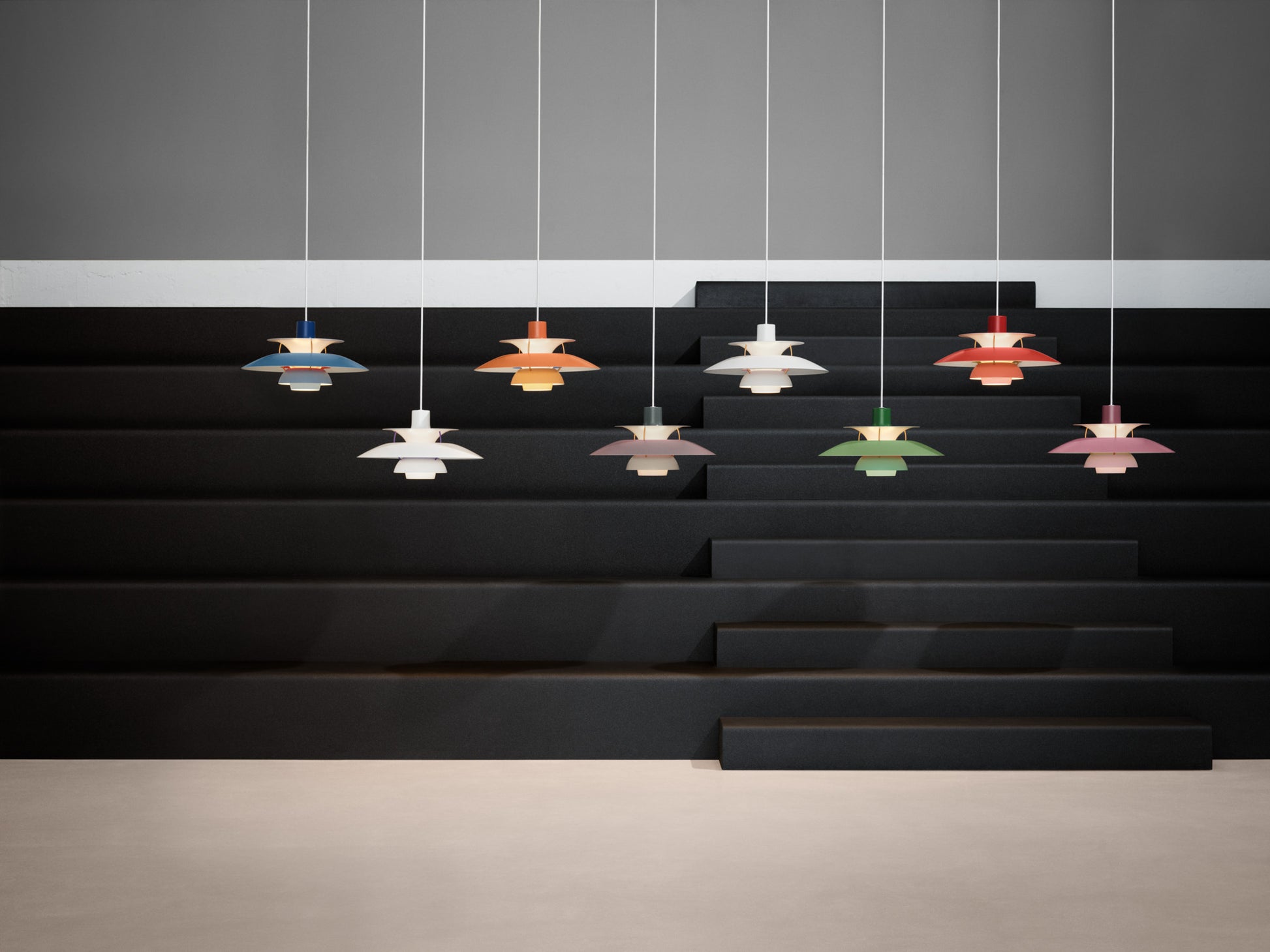 "絶えず白熱電球の形状やサイズを変える電球メーカーへの挑戦として、ポール・ヘニングセンは1958年にPH 5を開発しました。それは、ペンダントのメインシェードのサイズ(直径50 cm)にちなんで命名されました。ランプが発売されたとき、彼は、白熱電球メーカーが常識を考慮するか消費者の最善の利益を考えることを学ぶであろうという信念をどのように失ったかについて大胆に書き記しています。「わたしは運命を受け入れ、ルイスポールセンの承諾のもと、クリスマスライトであろうが金属フィラメントの100W電球であろうが、どんな光源も使用できる PH ランプをデザインした。ただし蛍光管だけは、今の形では長すぎて入らない!」 ヘニングセンはまた、PH 5 で使用する電球の光の演色性の向上にも取り組みました。光のスペクトルのうち、目の感度が最も低くなる赤色と青色の光を補完し、目の感度が最も高いスペクトル中央の黄色から緑にかけての光を抑えるため、赤と青の小さなシェードを加えたのです。当時、PH 5が、照明の設置方法や使用する光源に関係なく、100%グレア・フリーであるPHライトの代名詞になるとは、誰も思いもよりませんでした。現在は、光源も進化を遂げ、へニングセンの時代のように、赤と青の小さなシェードによる光色の調整が必要はなくなりました。それにもかかわらず、PH 5は進化を続け、色彩において最も先進的な内部の品質向上を目指しています。2020年には、モダンな印象を放つ「モノクロームリーズ」を発表しました。マットに塗装されたシェードは、モノクローム・ブラック、モノクローム・ホワイト、そしてモノクローム・ブルーの3色が新たに追加されました。2022年さらに新色が加わり、モノクローム・ペールローズ、モノクローム・オイスター、そしてパステルカラーのコンビネーションが新鮮なオイスター・ブルー・ローズ、ブルー・ローズ・ピーチが登場します。
