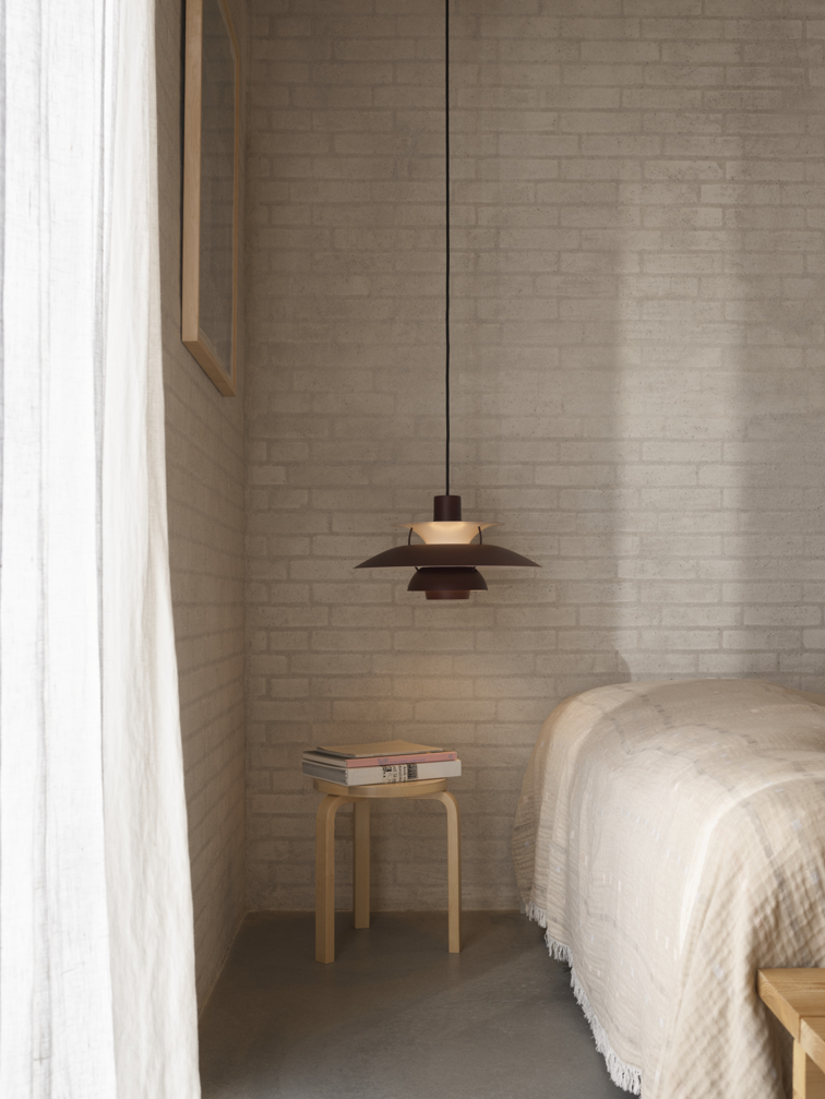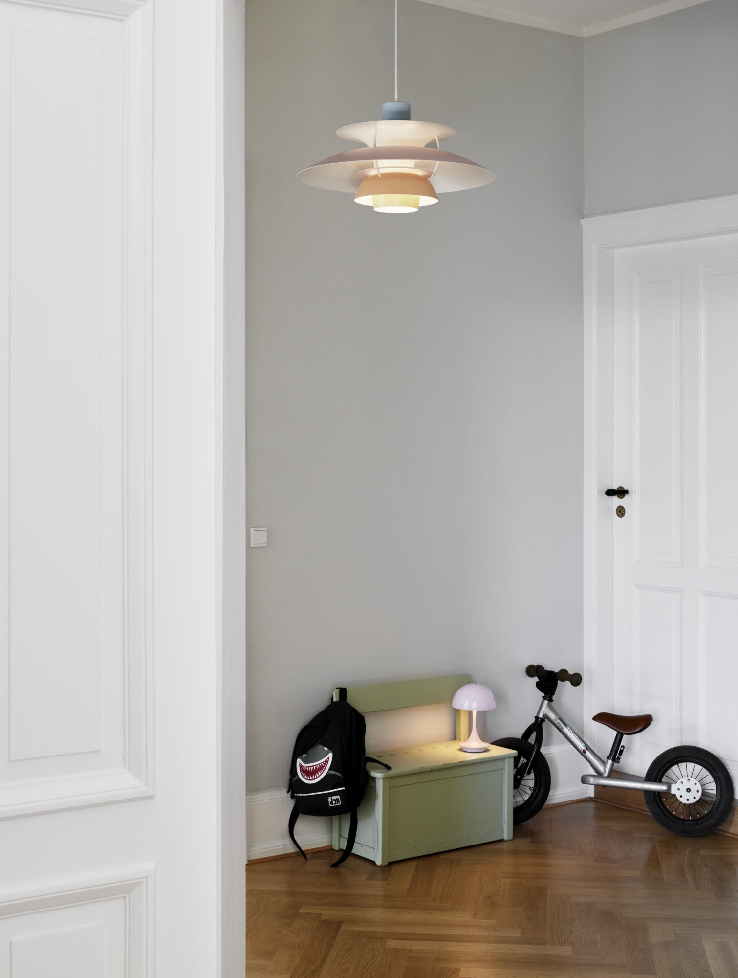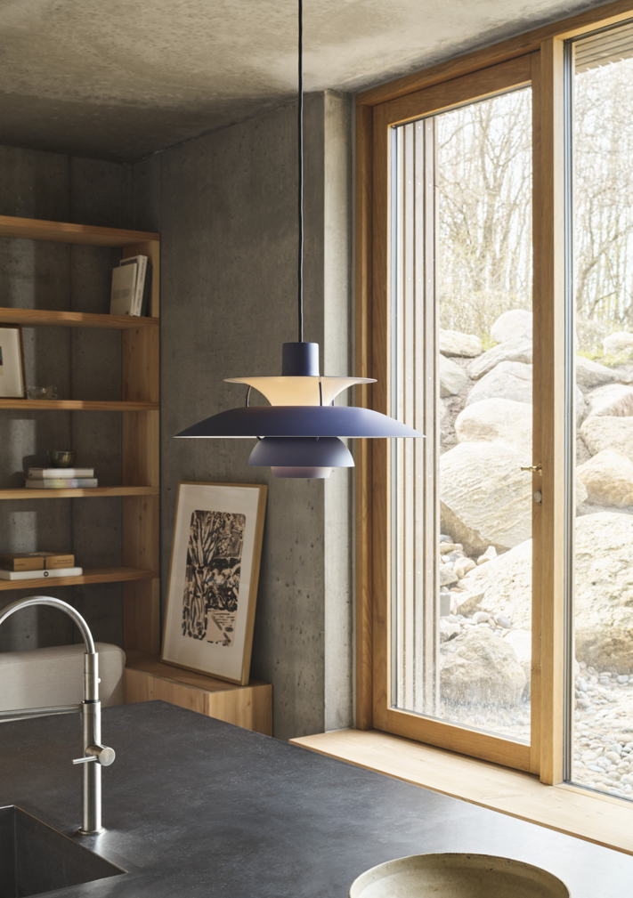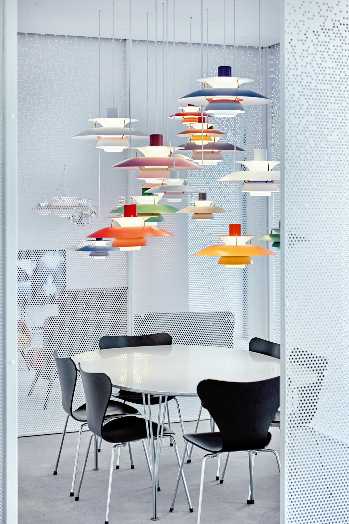 "絶えず白熱電球の形状やサイズを変える電球メーカーへの挑戦として、ポール・ヘニングセンは1958年にPH 5を開発しました。それは、ペンダントのメインシェードのサイズ(直径50 cm)にちなんで命名されました。ランプが発売されたとき、彼は、白熱電球メーカーが常識を考慮するか消費者の最善の利益を考えることを学ぶであろうという信念をどのように失ったかについて大胆に書き記しています。「わたしは運命を受け入れ、ルイスポールセンの承諾のもと、クリスマスライトであろうが金属フィラメントの100W電球であろうが、どんな光源も使用できる PH ランプをデザインした。ただし蛍光管だけは、今の形では長すぎて入らない!」 ヘニングセンはまた、PH 5 で使用する電球の光の演色性の向上にも取り組みました。光のスペクトルのうち、目の感度が最も低くなる赤色と青色の光を補完し、目の感度が最も高いスペクトル中央の黄色から緑にかけての光を抑えるため、赤と青の小さなシェードを加えたのです。当時、PH 5が、照明の設置方法や使用する光源に関係なく、100%グレア・フリーであるPHライトの代名詞になるとは、誰も思いもよりませんでした。現在は、光源も進化を遂げ、へニングセンの時代のように、赤と青の小さなシェードによる光色の調整が必要はなくなりました。それにもかかわらず、PH 5は進化を続け、色彩において最も先進的な内部の品質向上を目指しています。2020年には、モダンな印象を放つ「モノクロームリーズ」を発表しました。マットに塗装されたシェードは、モノクローム・ブラック、モノクローム・ホワイト、そしてモノクローム・ブルーの3色が新たに追加されました。2022年さらに新色が加わり、モノクローム・ペールローズ、モノクローム・オイスター、そしてパステルカラーのコンビネーションが新鮮なオイスター・ブルー・ローズ、ブルー・ローズ・ピーチが登場します。