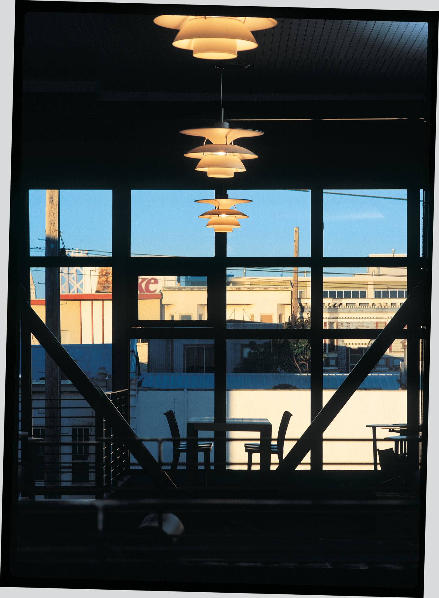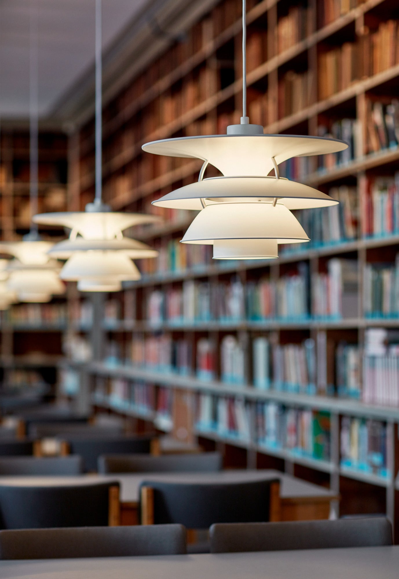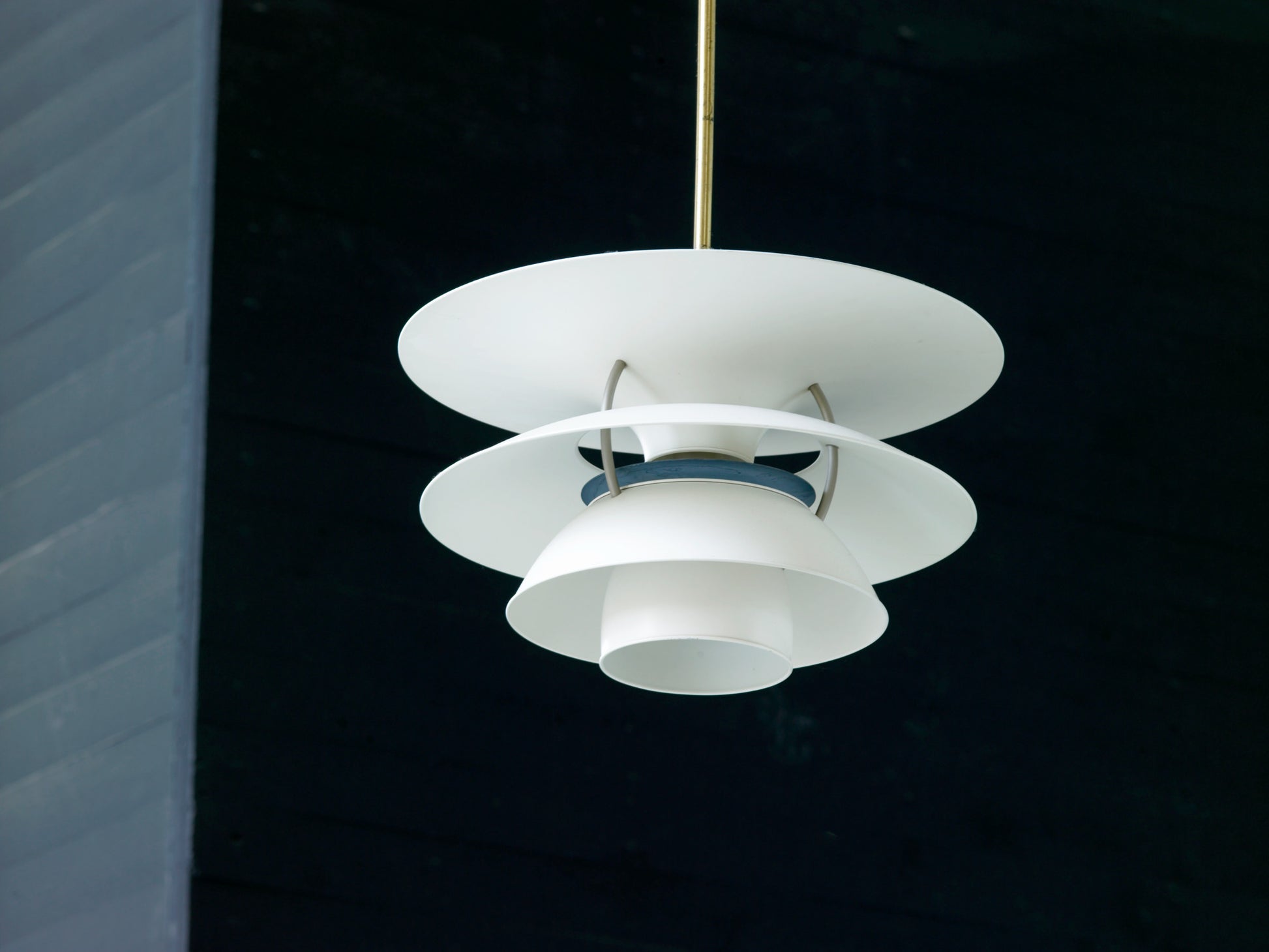 1925年から1926年にかけて、ポール・ヘニングセンは3枚シェードのシステムによる照明器具を開発しました。彼の複数シェードのランプが最初にデザインされたのは、パリで開催された展覧会のためでした。両者のパートナーシップは、ヘニングセンが亡くなる1967年まで続きました。グレア・フリーの光(眩しさの除去)、明るさが最も必要とされる場所に光を届けること、同時に柔らかい影をつくりだすこと。これらが、生涯を通じてPHが追及した重要テーマで、その光源は当時の白熱電球でした。1931年には4枚シェードのシステムを開発し、当時一般的だったシャンデリアの代わりに、空間の高い位置に吊るすことができるランプとして発表しました。PH の4枚シェードランプは、水平方向に反射される光を増やすことで、スタンダードな3枚シェードランプよりも周囲の壁面や棚を明るく照らすようにしたものです。このランプは1940年代にルイスポールセンのカタログリストから外されましたが、1979年、コペンハーゲンのシャルロッテンボー展示会場の高天井用照明として、ソーフス・フランセンとエベ・クリステンセンという二人のデンマーク人建築家により、一回り大きい PH 6½-6 として再現されました。電球内部に発生する反射グレアまでも完璧に取り除くため、二人の建築家は青色の小さなシェードをデザインにつけ加えました。より均質で快適な反射光を生むため、4枚のシェードはマットな白色塗装です。こうして生まれ変わったランプは博物館、美術館、展示室など、高天井空間のベース照明として最適です。1984年には、オーフス・コンサートホールの照明として、小型の 5-4½ が製作されました。