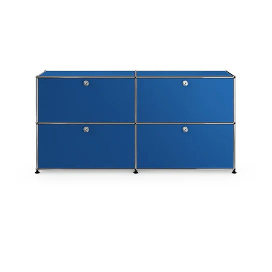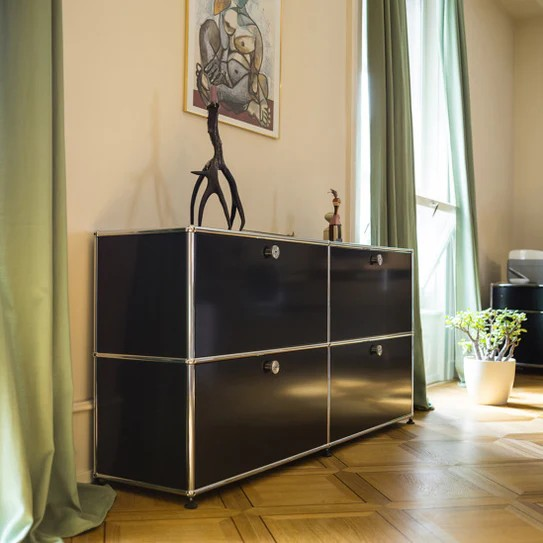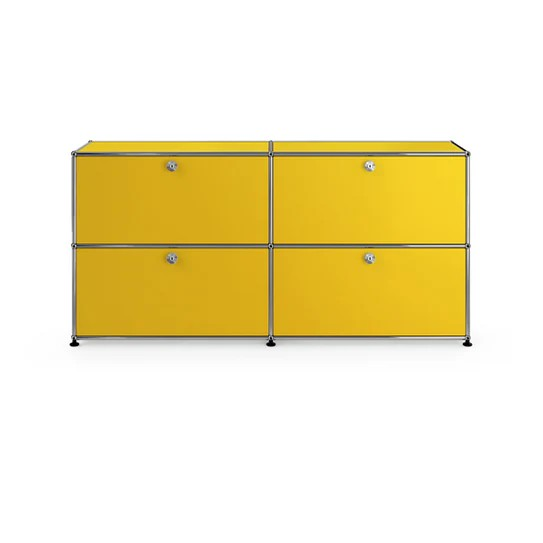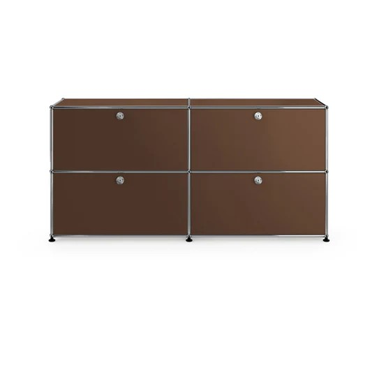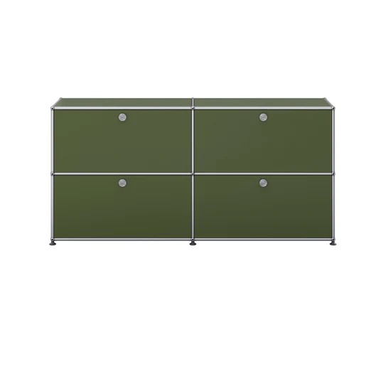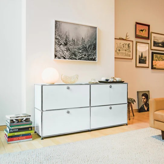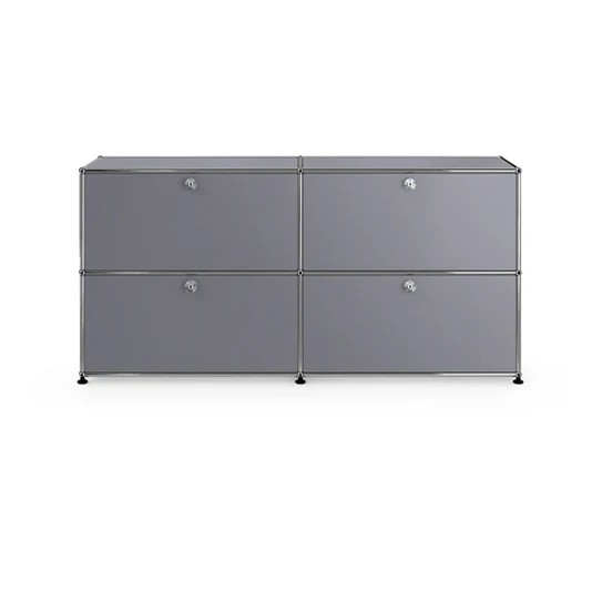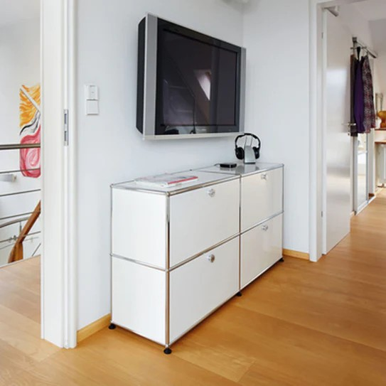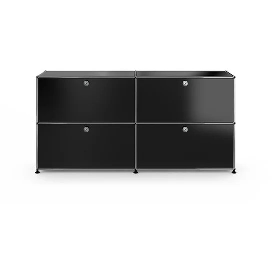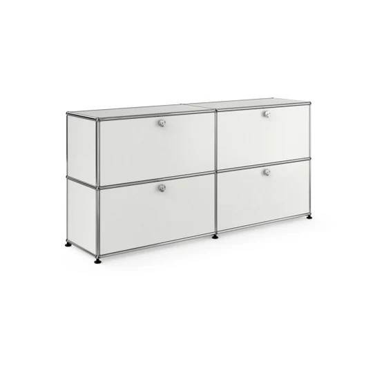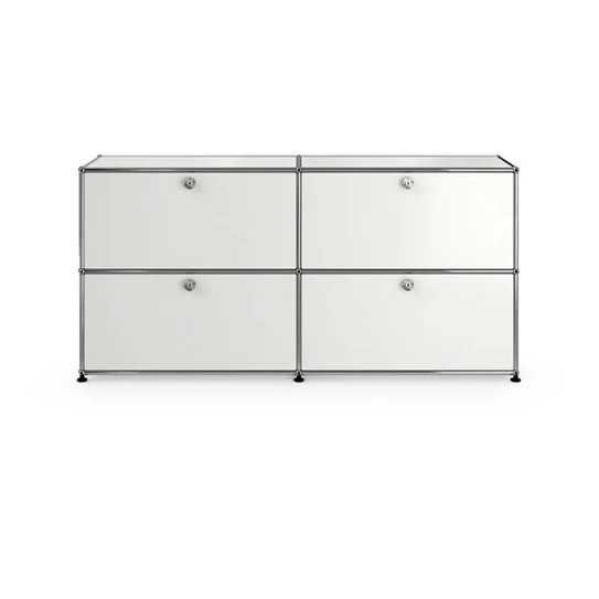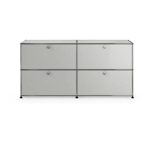 ドロップダウンドアが4つ付いた2列2段の収納キャビネット。A4ファイルを横に3つ並べておくことができ、縦にも収納することができます。収納ボックスなどでカスタムでき、無駄なく隠す収納として使っていただけます。リビングやダイニング、玄関、ワークスペースで活躍します。テーブルのサイドや窓の下などに合わせやすい高さです。