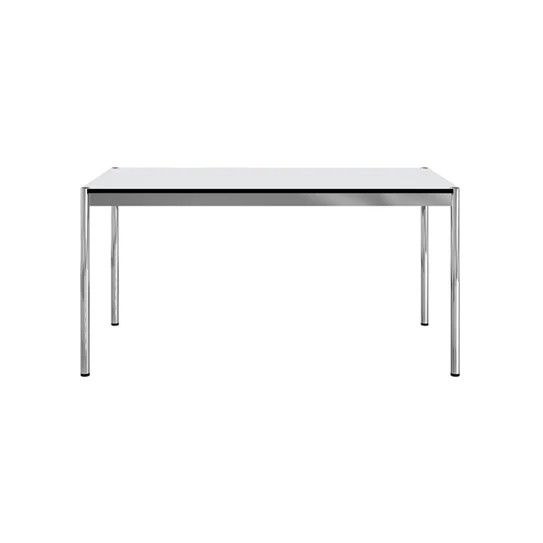 クロームメッキのフレームと4本のスティールチューブの脚が特長のテーブル。クラシカルモダンなデザインで、非常に頑丈な構造です。天板は汚れに強く扱いやすいラミネート(パールグレー)仕様で、デスクとしても使いやすいサイズです。